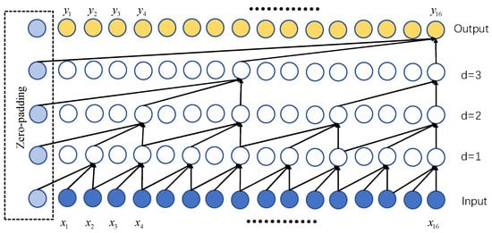 As illustrated in Figure 5, the kernel size of each dilated causal convolutional layer is 3. The dilation factor d grows from 1 to 4, which raises the effective history of neurons in the output layer from 3 to 15. In addition, to maintain the whole sequence information, each layer’s output is zero-padded to match the number of input sequences. The mathematical model of dilated causal convolution is as follows [49]: