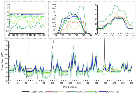 Each statistical metric has different advantages and disadvantages. The RMSE evaluates the performance of a predictive model based on the mean absolute error of the deviation between predicted and actual loads. However, it is susceptible to outliers. In comparison to the RMSE, the MAE reflects the mean absolute error between forecasted and actual loads. It is more resilient to outliers than the RMSE but does not show the real degree of prediction bias. The MAPE is a forecast accuracy measure that considers the relative difference between forecasted and actual loads. However, the MAPE does not apply when the actual load is zero. Therefore, it is vital to employ multiple statistical metrics to assess the prediction performance.