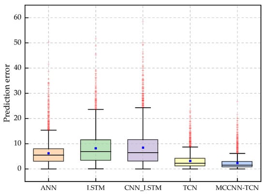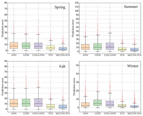 As shown in Table 13, by comparing the prediction results of the five models in each season, the advanced nature of the model proposed in this paper can be verified intuitively. Although the prediction performance of each prediction model is different in different seasons, the MCCNN-TCN model proposed in this paper has a significant decrease in MAPE, RMSE, and MAE compared with other models in each season. By taking the spring test set as an example, compared with other models, the MAPE of the MCCNN-TCN model decreased by 22.62%, 17.98%, 15.73%, and 6.66%, and the MAE decreased by 6.48, 5.43, 5.39, and 1.67, respectively. In addition, on the test set of each season, the RMSE, MAE, and MAPE of the MCCNN-TCN model and the TCN model are smaller than those of other models. However, since the TCN model does not have the characteristics of multi-time scale feature extraction, its RMSE, MAE, and MAPE in each season are higher than those of the MCCNN-TCN model. Additionally, the MCCNN-TCN model’s mean absolute error is relatively concentrated and much lower than the other models under each season, as illustrated in Figure 9. Comparing the prediction results on the test set for each season demonstrates that the MCCNN-TCN model proposed in this paper has a stable prediction performance. This shows that the MCCNN-TCN model can adapt to the load forecasting demand of each season in a year and has good robustness and engineering application value.