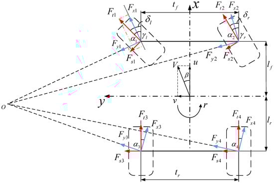 where is the vehicle mass; is the moment of inertia of the vehicle rotating around the axle; is the rolling resistance of the vehicle; is the air resistance of the vehicle; is the longitudinal velocity of the vehicle; is the lateral velocity of the vehicle; is the yaw velocity of the vehicle; and are the wheelbase of the vehicle from the center of mass to the front and rear axles, respectively; and are the wheelbase of the front and rear wheels, respectively; and are respectively the left front wheel angle and right front wheel angle of the vehicle; is the slip angle of tire; and are the actual left and right wheel angles; is the driving force of the tire; is the side force of the tire; is the longitudinal force of the tire; and is the tangential force of the tire (). The longitudinal force and tangential force mentioned in Equations (1)–(3) can be expressed by the driving force and side force in Equation (4).