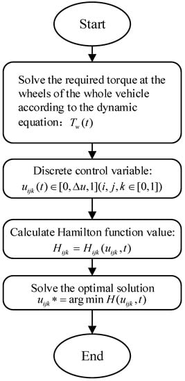 The control strategy based on the PMP adopts the cyclic iterative method to optimize the output torque of the driving torque reasonably, which can minimize the power consumption of the vehicle. The specific steps [30] are as follows.
