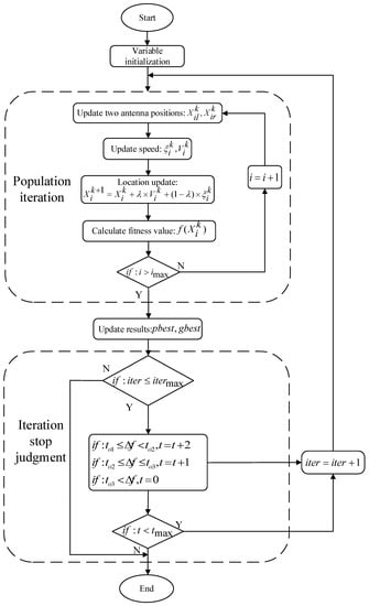 Set up a counter, tolerance set , and maximum count . According to the research objective of this paper, the tolerance set and the maximum count value are taken as appropriate values, where . After the optimal fitness value is obtained in each iteration, the fitness value is compared with the optimal fitness value in the previous iteration in the process of iteration. The fitness value in the current iteration must be less than or equal to the fitness value in the last iteration. Therefore, the corresponding judgment is made for the difference between the two fitness values: