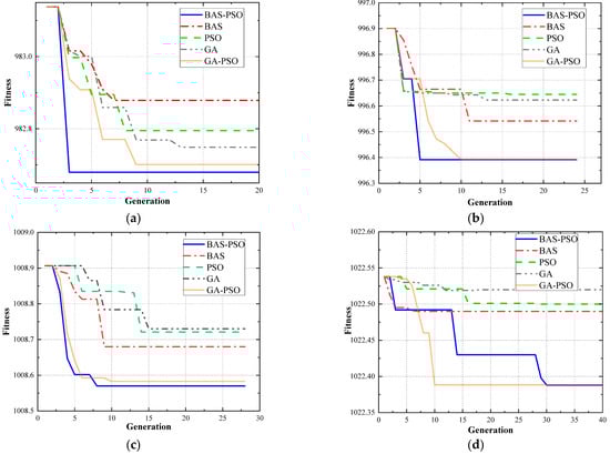 As shown in Figure 4a–d, the results and operation speed of the three random algorithms are random. Both fusion algorithms will quickly converge to this optimal solution. Differences in subjects and working conditions may have an impact on the search. The computational efficiency and speed of the algorithm fluctuate to a certain extent. The BAS-PSO algorithm in Figure 4a–c can find the optimal value efficiently and quickly, while Figure 4d shows that the BAS-PSO algorithm will not quickly iterate near the optimal value but can finally find the optimal value. The adaptive fusion of the two algorithms improves the speed of the algorithm and the stability of search efficiency to a certain extent. In a few cases, the stability will be reduced, and the optimization speed will be slow. However, under the current working conditions of the research object in this paper, the search speed and efficiency of the BAS-PSO algorithm are significantly higher than other algorithms. When the appropriate iteration stops, conditions are added to the BAS-PSO algorithm.