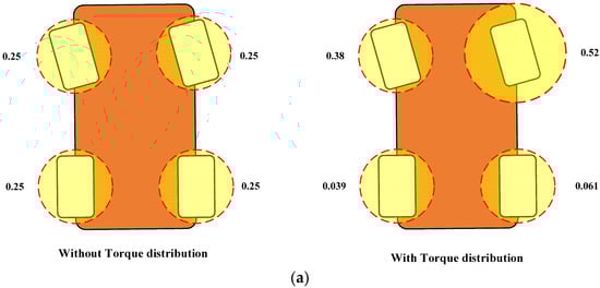 Assuming that the distribution of the vehicle’s four wheels on turning of the torque is equal, the four wheels of driving forces are equal. In this case, the driving force distribution of the four wheels is relatively uniform, and the direct yaw moment due to uneven driving force distribution will become very small by Equation (11). When the vehicle’s four wheels take TVD control, the direct yaw moment of the vehicle changes, which will do work on the vehicle’s yaw rotation and have an effect on the vehicle’s lateral operation. Therefore, the effect of the direct yaw moment on the lateral operation of the vehicle should be considered. If the work of yaw rotation is done to the vehicle in turning, it will make a certain contribution to the vehicle’s steering and reduce the energy consumption required during turning.