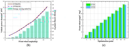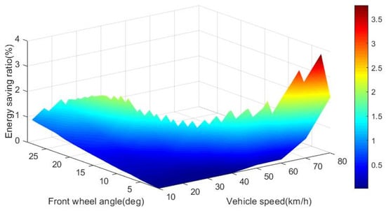 According to the analysis, the tangential forces will generate a component force opposite to the vehicle’s movement direction to block the vehicle turning when the front wheel turns. When the front wheel angle increases, the motion resistance will also increase [26,27]. When the vehicle torque is distributed in a directional manner, the distribution of driving force changes, and the direct yaw moment is generated. The direct yaw moment can compensate for the front wheel angle and direct yaw moment when the vehicle is turning to a certain extent, which can reduce the total power loss. Therefore, appropriately taking TVD control can reduce the energy consumption of vehicle turning.