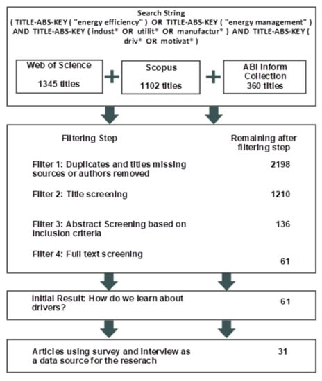 | Scopus | Title, Key Word, Abstract | (TITLE-ABS-KEY ("energy efficiency") OR TITLE-ABS-KEY ("energy management") AND TITLE-ABS-KEY (indust* OR utilit* OR manufactur*) AND TITLE-ABS-KEY (driv* OR motivat*) AND NOT TITLE-ABS-KEY (household) AND NOT TITLE-ABS-KEY (storage) AND NOT TITLE-ABS-KEY (transport*) AND NOT TITLE-ABS-KEY (shipping) AND NOT TITLE-ABS-KEY (grid) AND NOT TITLE-ABS-KEY (renewable) AND NOT TITLE-ABS-KEY (solar) AND NOT TITLE-ABS-KEY (wind) AND NOT TITLE-ABS-KEY (geothermal) AND NOT TITLE-ABS-KEY (bio*) AND NOT TITLE-ABS-KEY (nuclear) AND NOT TITLE-ABS-KEY (certificate) AND NOT TITLE-ABS-KEY (distribution) AND NOT TITLE-ABS-KEY (construction)) AND PUBYEAR > 2006 AND (EXCLUDE (SUBJAREA, "COMP") OR EXCLUDE (SUBJAREA, "MATE") OR EXCLUDE (SUBJAREA, "PHYS") OR EXCLUDE (SUBJAREA, "CHEM") OR EXCLUDE (SUBJAREA, "MATH") OR EXCLUDE (SUBJAREA, "EART") OR EXCLUDE (SUBJAREA, "AGRI") OR EXCLUDE (SUBJAREA, "BIOC") OR EXCLUDE (SUBJAREA, "MEDI") OR EXCLUDE (SUBJAREA, "NURS") OR EXCLUDE (SUBJAREA, "IMMU") OR EXCLUDE (SUBJAREA, "VETE") OR EXCLUDE (SUBJAREA, "NEUR") OR EXCLUDE (SUBJAREA, "DENT")) AND (EXCLUDE (DOCTYPE, "ch") OR EXCLUDE (DOCTYPE, "bk") OR EXCLUDE (DOCTYPE, "sh") OR EXCLUDE (DOCTYPE, "no") OR EXCLUDE (DOCTYPE, "ab") OR EXCLUDE (DOCTYPE, "bz") OR EXCLUDE (DOCTYPE, "ed") OR EXCLUDE (DOCTYPE, "er") OR EXCLUDE (DOCTYPE, "le")) AND (LIMIT-TO (PUBYEAR, 2020)) |