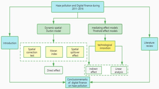 In summary, these studies have indicated that the question of environmental pollution has attracted extensive research attention. Although this research provided a strong background for this study, there were still deficiencies that could be improved on. The advancement of ICT infrastructure and services, particularly digital finance, is an important driver of economic growth that can affect environmental quality. However, there have been few studies on the possible links between digital finance and haze pollution. Previous studies have mainly focused on the direct effects of ICT on the environment, while ignoring the more important indirect effects of ICT (digital finance). Furthermore, the impact of digital finance on haze pollution is heterogenous across different regions and different periods. However, few studies have focused on the spatial effects and regional differences of ICT on haze pollution. In addition, the overall structure of the paper is shown in Figure 1.