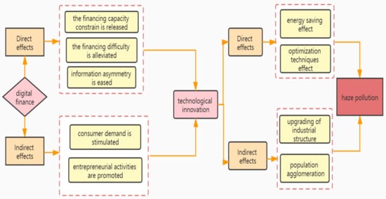 Unlike previous studies, this study considered the impact of digital finance on haze pollution from the perspective of indirect effects. It was found that digital finance reduces haze pollution through technological innovation. Refer to the mechanism analysis diagram in Figure 2. The mechanism by which digital finance influences haze pollution was analyzed as follows.