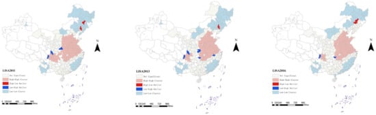 As seen in Table 5, the global Moran’s I values for the analysis of haze pollution as well as digital finance were significantly positive in 2011–2016 in China. Thus, both of them had significant spatial autocorrelation and spatial clustering phenomena in the relationship between haze pollution and digital finance in China. To explain this spatial correlation more intuitively, local indicator of spatial association (LISA) scatter plots of haze pollution in 284 cities in 2011 and 2016 were constructed. Figure 3 shows that the trend of haze pollution in China was narrowing and had notable local spatial agglomeration characteristics.