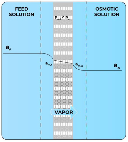 Osmotic membrane distillation crystallization (OMDC) is an innovative technique in which two liquids are brought into contact through a non-selective hydrophobic microporous membrane [10]. Because the concentration is not the same on both sides, this induces a water activity difference and leads to the evaporation of water from the feed to the osmotic side. Thus, the driving force is the vapor pressure gradient created by the water activity difference between the two sides of the membrane. Figure 1 depicts the mass transfer profile for the OMDC system [7,8].