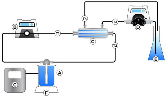 Schematic diagram of the membrane distillation crystallization setup: A feed solution; B gear pump; C membrane contactor; D peristaltic pump; E osmotic solution; F balance; G water bath/cooler; T1–T4 thermometers.