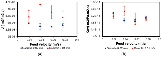 Effect of feed and osmotic velocities on (a) flux and (b) Kov. The concentration of the NaHCO3 was at a maximum, and feed and osmotic solutions were at room temperature.