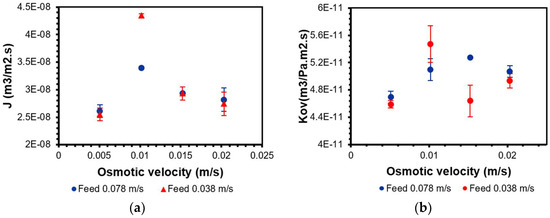 (a) Flux for changes in osmotic flow rate. (b) Kov for changes in osmotic flow rate. The concentration of NaHCO3 was at a maximum, and the feed and osmotic solutions were at room temperature.