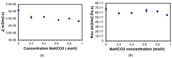 Effect of the concentration of NaHCO3 in the feed solution on: (a) flux and (b) Kov. Feed velocity was 0.038 m/s, osmotic velocity was 0.01 m/s, and osmotic and feed solutions were at room temperature.