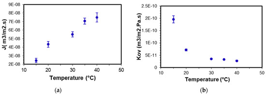 Two parameters allow characterization of the operating conditions of the membrane system, namely, the transmembrane flux (J, m3/m2·s) and the overall mass transfer coefficient (Kov, m3/m2·Pa.s). J was calculated by measuring the weight of the feed tank over time and recorded in intervals of 20 min. The flux shown in the figures is an average of the fluxes during the experiment, calculated by Equation (1) [12,19,20].