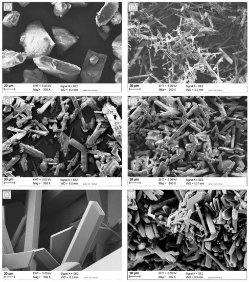 SEM images of NaHCO3, comparing commercial crystals (a) with crystals obtained using osmotic membrane distillation crystallization at different temperatures: (b) 15 °C; (c) 20 °C; (d) 30 °C; (e) 35 °C; (f) 40 °C.