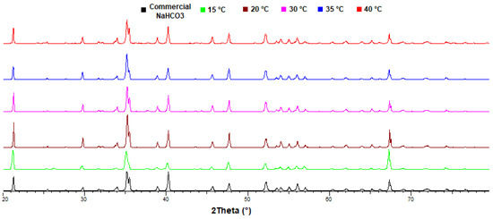XRD analysis was performed on various bicarbonate crystals. The first was the original sodium bicarbonate powder from the industrial supplier. The second to the sixth samples analyzed were NaHCO3 crystals obtained after membrane crystallization distillation at 15, 20, 30, 35, and 40 °C for the feed solution. A comparison of the different XRD spectra is shown in Figure 8. As previously reported [32,33], all the spectra compared showed peaks at 29.7, 35.4, and 40.8 (2Theta), attributed to the NaHCO3 crystal phase.
