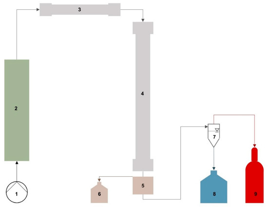 Schematic flow diagram of SCWG reactor and peripheral components. (1): pump, (2): biomass feed cylinder, (3): preheating section, (4): reactor, (5): salt separation, (6): salt brine, (7): gas-liquid phase separation, (8): reactor effluent, (9): product gas.