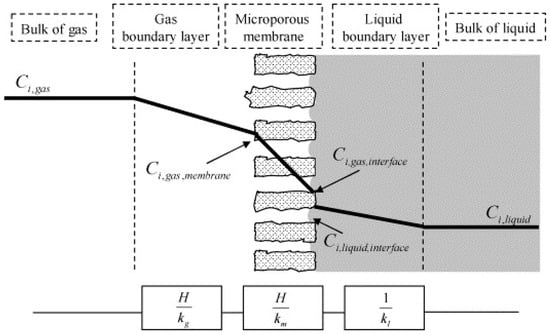 In a gas-liquid membrane contactor, the membrane is the barrier between the two phases, which flow on their opposite sides. In this formulation, the membrane, except for separating and preventing the mixing of the two phases, actually provides the interface for their contact. Specifically, if a hydrophobic membrane is employed, its pores are filled with gas, and as long as the pressure of the liquid is slightly higher than that of the gas, an immobilized gas-liquid interface is formed at the pores’ mouth on the liquid side. Figure 3 shows a schematic representation of the mass transfer phenomena in a gas-liquid contact membrane, along with the relevant mass transfer resistances for a hydrophobic membrane.