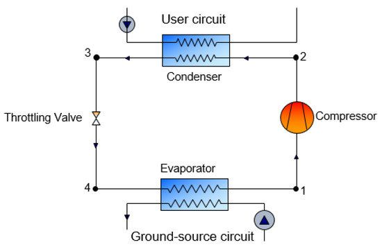 Heat pump technology is based on a thermodynamic reverse cycle, driven by electricity, which is able to move an amount of thermal energy from a low temperature source to a higher temperature sink. Such systems take advantage of thermodynamic properties of several fluids, named refrigerants, to perform the cycle. A heat pump basically consists of four components: an evaporator, a compressor, a condenser and an expansion device [24,25]. In the evaporator, the refrigerant, at low pressure and two-phase state, absorbs heat from the low temperature energy source in order to boil and move to the superheated vapour state. Then, its pressure is increased by an electrically driven compressor. The high pressure level is determined in order to allow the refrigerant to heat up the high temperature energy sink in the condenser. The exchanged heat to the energy sink liquefies the refrigerant, which moves to the compressed liquid state. Then, the liquid refrigerant enters an expansion device, i.e., an orifice, valve or capillary tube, which is designed to drop the pressure from the condensing level to the evaporating level. The expansion device operation is fundamental for the heat pump performance, since it sets the pressure levels in the two heat exchangers. Figure 3 shows the basic heat pump scheme, the most widespread cycle configuration for residential heat pumps; several other more complex cycles can be implemented [26]. In the case of a GSHP, the energy sink and source become respectively the user circuit and the ground-source circuit. Figure 4 shows the heat pump operation on a pressure-enthalpy diagram. The main parameter to evaluate the performance of heat pumps is the Coefficient of Performance (COP), given by the ratio between the condenser power and compressor power. Such a parameter depends on several variables: amongst the most important there are is refrigerant thermodynamic properties, components design and working conditions (i.e., pressure levels in the heat exchangers, mass flow rate, etc.). A corresponding parameter, EER, is used to evaluate the performance of the heat pump in cooling mode and is calculated as the ratio between the power absorbed at the evaporator and the compressor power. In order to give a basic mathematical model of heat pump, the following Equations (1)–(6) are given, assuming to set some parameters such as the superheating at the evaporator outlet , the subcooling at the condenser outlet and the compression isentropic efficiency . The symbols p, T, h and s refer to pressure, temperature, enthalpy and entropy of fluid, respectively. The subscript ev and cond refer to the evaporation and the condensation. The numerical subscripts refer to the thermodynamic state of fluid during the operation (see Figure 3 and Figure 4).