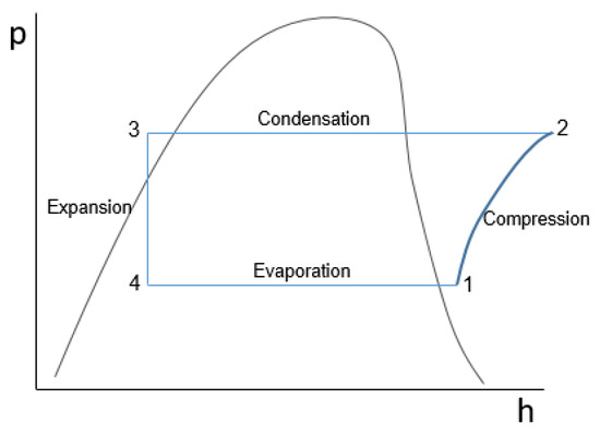 Pressure-enthalpy diagram for basic heat pump cycle. The black line represents the saturation curve, while the blue line represents the thermodynamic cycle. The numbers refer to Figure 3.