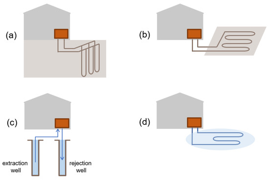 GSHP main typologies: (a) ground coupled heat pump with vertical GHE; (b) ground coupled heat pump with horizontal GHE; (c) ground water heat pump; (d) surface water heat pump.