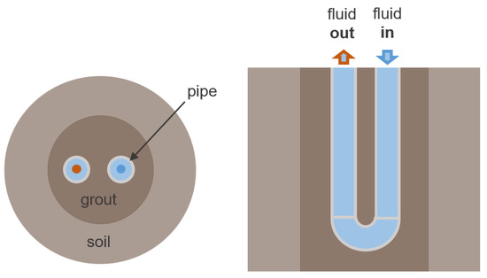 Tube configuration inside the BHE is a key parameter to improve heat transfer between the ground and the fluid circulating inside the borehole, since it can increase the available heat transfer area. A single U-tube is the basic configuration for a BHE (Figure 6).