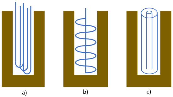 To enhance the BHE performance, three main configurations have been proposed: multi U-tube BHE, helical BHE and coaxial BHE. The multi U-tube configuration (Figure 7a) is the simplest, consisting of two or more single U-tubes connected to the same borehole [40]. A limit for this application can be set by the larger borehole diameter to host the tubes. The 3U-tube BHE have been tested by Aydin and Sisman [41], with a thermal response test (TRT), while the heat transfer of 4U-tubes and 5U-tubes BHE has been investigated by numerical simulation resulting in no sensible improvement with respect to the 3U-tube BHE. Moreover, the helical BHE (Figure 7b) can require a larger borehole diameter. However, it allows an increase in the heat transfer area greater than the 3U-tube configuration. Such an increase may limit the use of such a configuration to energy piles. A numerical model was developed by Zarrella et al. [42] to evaluate the dependence of several designs and operation parameters, considering the heat conduction along the vertical axes of the borehole between the ground and the BHE. A 40% heat transfer increase was calculated with respect to the double U-Tube configuration. The coaxial BHE (Figure 7c) consists of an inner tube installed inside a larger coaxial outer tube, both cylindrical. The conventional coaxial BHE, made of inflexible material such as steel, results in difficulties for transportation and is an expensive procedure [40]. However, such a configuration is expected to outperform the single U-tube [43]. Oh et al. [43] studied the influence of pipe (stainless steel or HDPE) and grout thermal properties on a coaxial BHE heat exchange, highlighting the importance of high thermal conductive materials.