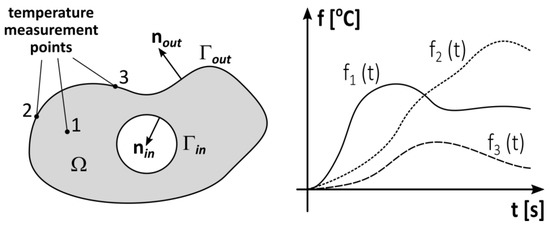 where n—unit normal vector to boundary, Tb—temperature on the domain boundary, –heat flux on the domain boundary, h—heat transfer coefficient on the domain boundary Γ, and Tm—temperature of the medium. A phenomenon characterized by Equations (1)–(7) in which all dimensions, properties, the initial condition, and the boundary conditions over the entire boundary are specified is known as a direct transient heat conduction problem. If part of boundary conditions (5)–(7) is unknown, the problem is ill-posed, and additional internal temperature measurements are required