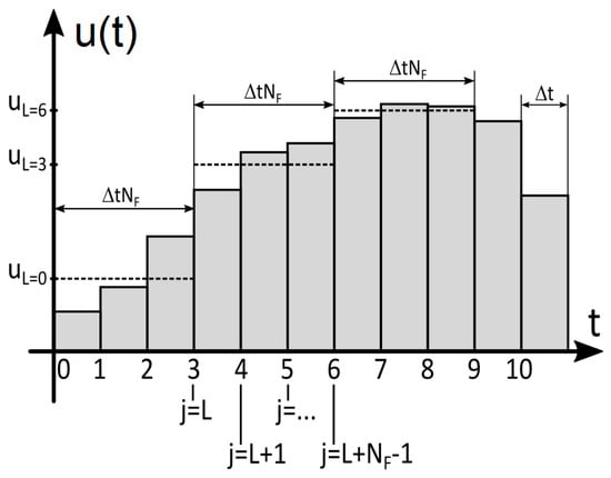 - Solve the initial–boundary problem formulated by Equations (1)–(7) in interval taking the initial value of vector uL(L = NF) = uL(L = 0) and the obtained temperature distribution in time for the initial condition (4);