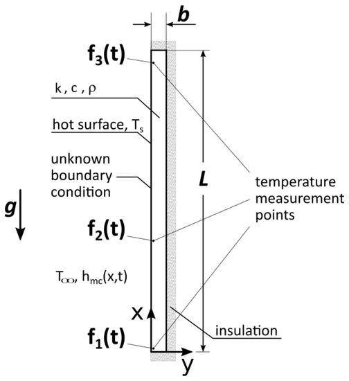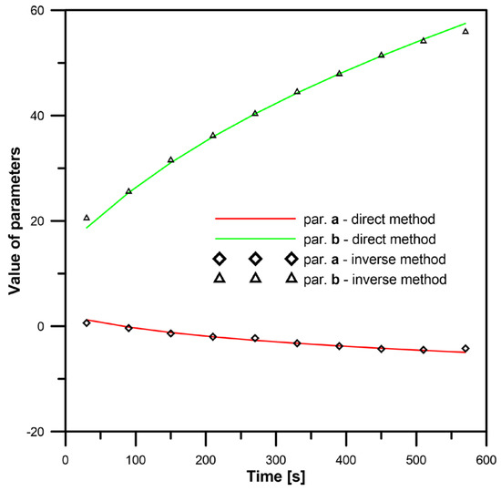 It was assumed that the unknown parameters a and b from Equation (13) were functions of time. There were two unknown transients and three given measured temperature transients. Vector uL consisted of two components: a(tL) and b(tL).