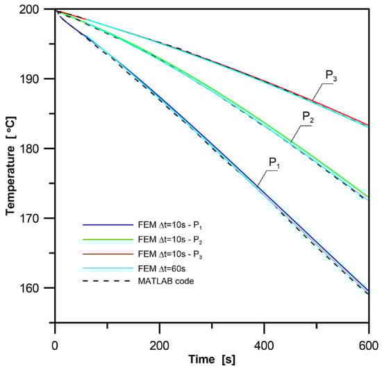 The temperature histories taken from the FEM with time step Δt = 10 s were considered as “exact measured data”. To obtain numerical tests similar to real conditions, “noisy measured data” were formulated by adding normal random errors of ±0.5 °C of the zero mean to “exact measured data” (σf = 1/6). These temperature transients in nodes P1, P2, and P3 for the inverse solution are shown in Figure 6. They are compared to the data presented in the available literature [14].