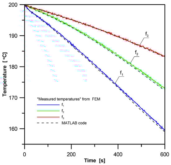 The temperature distribution during the cooling process was calculated using the FEM implemented in the ANSYS program [21]. ANSYS Mechanical APDL was used in the batch mode. The plate was discretized into 2000 linear plane finite elements. Ten elements were used along its thickness and 200 along its height. The convective boundary condition was assumed on the respective surfaces of 200 elements. The temperature histories obtained from the FEM were used as “exact measured data”. When the calculations were carried out with the time step of Δt = 60 s, the temperature distribution was very close to the one presented in [14], which was measured and generated by the MATLAB code. Figure 5 shows temperature transients f1(t), f2(t) and f3(t) in points P1, P2, and P3, respectively, whose location is given in mm based on the coordinate system in Figure 4: (3, 1), (62, 1), and (191, 1). A reduction in the time step to Δt = 10 s involved a slight difference in the temperature transients.