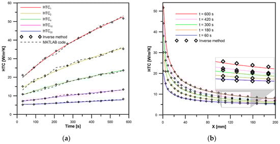 Finally, the unknown time- and space-dependent heat transfer coefficient distribution in the mixed-convection regime was calculated. The comparison between estimated and exact values is presented in Figure 8. The HTC transients in Figure 8a are shown for the following x coordinates: 1, 6, 16, 59, and 195 mm. They are also compared to the heat transfer coefficients calculated by the MATLAB code in paper [14]. It needs to be noted that in [14] twenty measurement points were used, and the investigation considered errors of ±0.1 °C. Despite the smaller number of measurement points and larger disturbance of measured temperatures than in [14], the obtained results were comparable. Additionally, the proposed method was easier to apply, as it allowed the use of commercial programs.