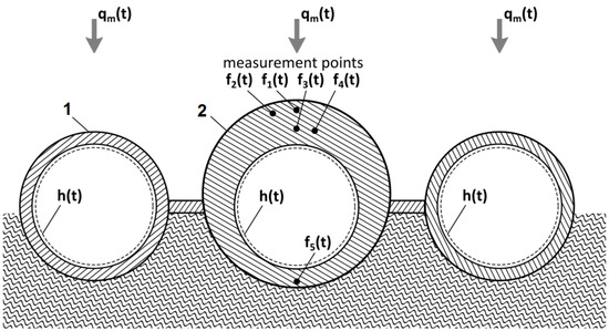 The furnace wall tubes are usually welded together using steel bars to make membrane wall panels, which are exposed to the furnace on one side and insulated on the other, as presented in Figure 9. A tubular-type instrument (flux tube) was installed to enable accurate measurement of the absorbed heat flux qm and heat transfer coefficient h inside the membrane wall in steady-state conditions [22]. The proposed method was used to identify the absorbed heat flux and the heat transfer coefficient during transient operation.