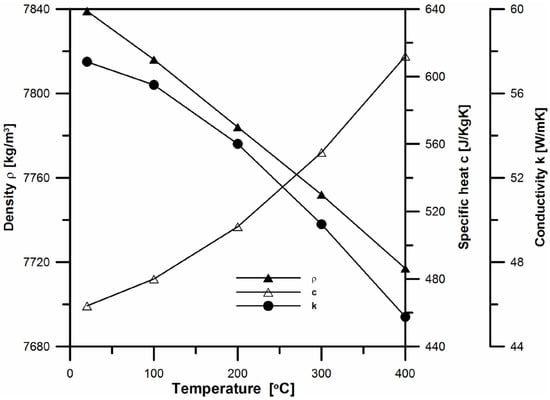 If the material is isotropic, then . All material properties (c—specific heat, k—thermal conductivity, and ρ—density) are usually known functions of temperature. Fourier’s law applies to all engineering applications for which the infinite speed of a heat propagation can be assumed. Transient heat conduction problems are initial–boundary problems for which appropriate initial and boundary conditions should be defined [17]. The initial condition specifies the temperature value of the non-simply connected domain Ω at its first moment t0 = 0 s: