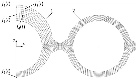 Division of the non-simply connected domain into finite elements: 1—flux tube, 2—waterwall tube, f1(t)–f5(t)—location of temperature sensors.