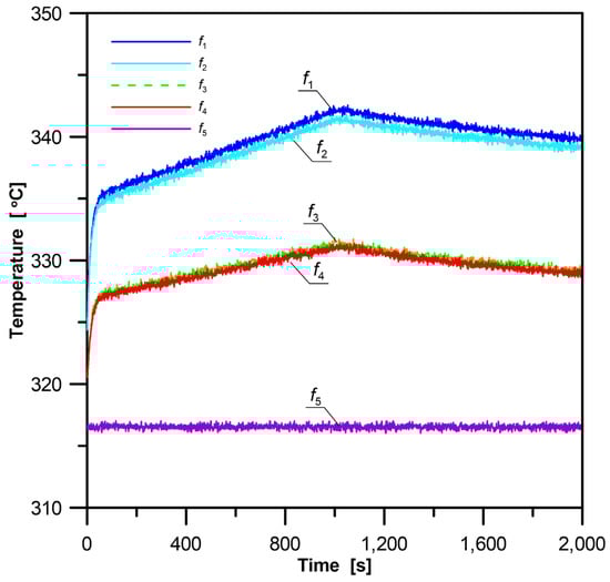 Steam temperature totals Tm = 316.52 [°C]. The local heat flux on the membrane wall and on the flux tube was evaluated numerically using the FEM-based ANSYS program [21]. Due to symmetry, only the representative waterwall section presented in Figure 11 needs to be analysed. Temperature transients f1, f2, f3, f4, and f5 in the locations illustrated in Figure 9 were calculated using the FEM and disturbed with normal random errors ±0.5 °C of the zero mean (σf = 1/6). The generated “noisy measured data” for the inverse solution are shown in Figure 12.