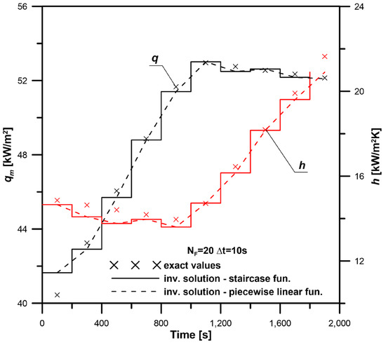 The proposed method was tested with the time step of Δt = 10 s. The values of 0 and 100,000 <W/m2 K, W/m2>, respectively, were chosen in vector uL for the lower and the upper bounds of the sought parameters. The starting vector was assumed as uL(L = 0) = <15,000 W/m2K, 40,000 W/m2>.