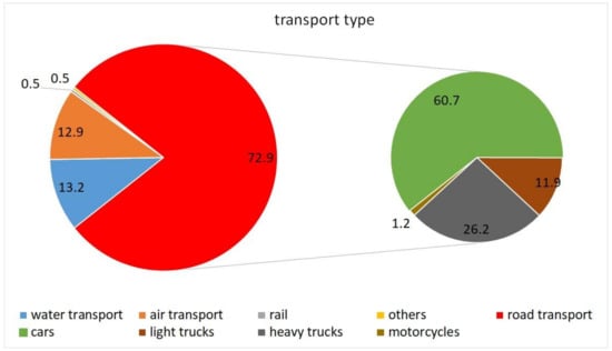 Distribution of CO2 emissions in the transport sector and distribution of emissions in road transport (own drawings based on [9,10]).