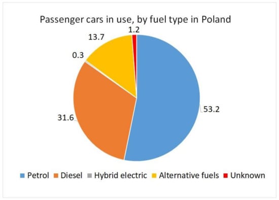 The passenger car industry is dominated by combustion cars with spark-ignition engines. However, recently, the market has seen an increase in the number of vehicles using alternative fuels of approx. 14% and an increase in the number of hybrid cars, although they currently account for less than 0.5% of all vehicles. These numbers are still changing in favour of electric cars, although there are relatively few of them in Poland, for example [11] (Figure 2).