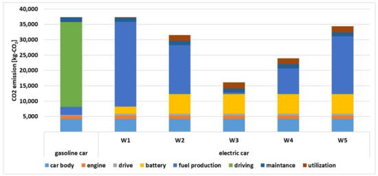 - In the case of electric cars, the production and disposal of batteries have a very large impact on cumulative CO2 emissions. In this stage, producers of electric cars can improve their processes so that electric cars are more environmentally friendly by reducing CO2 emissions. Another factor that significantly affects the amount of CO2 emissions from electric cars is the type of electricity source (variants W1–W5).