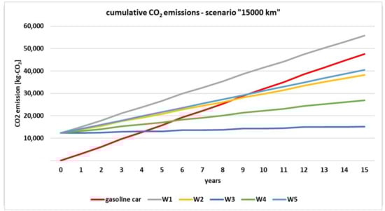 This work includes calculations of the cumulative CO2 emissions of two comparable cars—the VW Golf VII—one with a combustion engine and the other with an electric motor. Calculation of CO2 emissions was performed, taking into account the stages of production, utilization and use of the above-mentioned vehicles. For the use phase, it was assumed that the total mileage of the car will be 150,000 km over 10 years. For the electric vehicle, calculations were made assuming five different sources of electricity (from coal only, from natural gas only, from PV and wind turbines, an average mix of European power sources and an average mix of Polish power sources; W1–W5 designations, respectively). For individual sources of electricity, cumulative CO2 emissions were taken into account, that is, resulting both from the production of electricity and the use of the resources (for example, technical service per 1 kWh of electricity produced). The obtained results of the analysis show that for the adopted assumptions regarding operation, for variants W2–W5, the use of an electric car results in lower cumulative CO2 emission than a the use of a combustion car. For a combustion car, the value was 37,000 kg-CO2, and for an electric car, depending on the variant, the value was 43, 31, 16, 23 and 34 thousand kg-CO2 for variants W1 to W5, respectively. Based on the emissions results obtained for individual stages of the use of selected vehicles, a comparative analysis of cumulative CO2 emissions was performed. The purpose of this analysis was to determine whether the replacement of an existing combustion car (that has already been manufactured; therefore, this part of the analysis does not include CO2 emissions in the production stage) with a new electric car, which has to be manufactured, therefore associated with additional CO2 emissions, would reduce cumulative CO2 emissions. Considering three adopted average annual car mileages (3000, 7500 and 15,000 km) and the previously described power options (W1–W5), we sought an answer as to whether the use of a new electric car would be burdened with lower cumulative CO2 emissions. In this case we assumed an analysis time of 15 years. For the worst variant from the point of view of CO2 emissions (W1, electricity from coal power sources only), further use of a combustion car is associated with lower cumulative CO2 emissions than the purchase of a new electric car over the entire analyzed period of 15 years. In turn, for the most advantageous variant (W3, electricity from PV or wind power sources) with an annual mileage of 3000 km, the purchase of a new electric car results in higher cumulative CO2 emissions throughout the analyzed period, whereas for an annual milage of 7500 or 15,000 km, replacing the car with an electric car “pays back” in terms of cumulative CO2 emissions after 8.5 or 4 years, respectively.