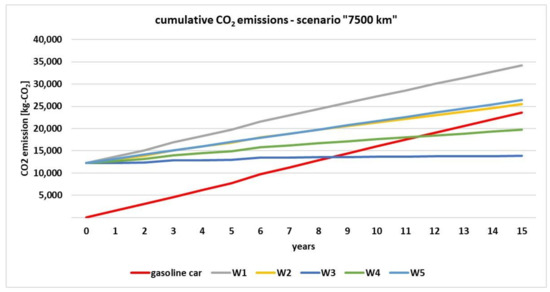- However, in the case of an efficient combustion car, its replacement with an electric car will result in greater cumulative CO2 emissions than the further use of the internal combustion car, although this depends on the average annual mileage and the source of electricity production, according to the data in Table 6.