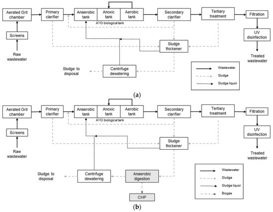 Plant scheme (a) Original WWTP Scheme; (b) Modified scheme of the WWTP with an AnSS stage and CHP highlighted in grey.