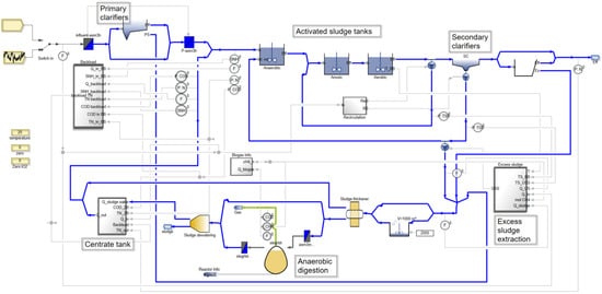 The model includes an anaerobic digestion stage, which is based on the model proposed by Siegrist [19], standard for these applications in SIMBA, as presented in Figure 2. The temperature for the anaerobic digestion stage is 37 °C, and it is assumed constant.