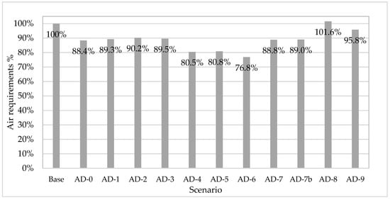 The air requirements in the scenario with anaerobic sludge stabilisation (AD-0) are 10.7% lower than in the original scenario with AeSS (Base) (see Figure 3). This is due to the reduction of biomass in the system.