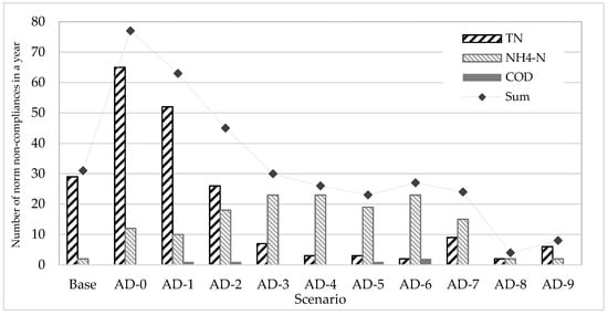 The modifications in the denitrification volume proportion also are very effective, reducing the total number of norm non-compliances, i.e., for TN and NH4-N, even further to only 30 per year, reaching the level of the Base scenario (with AeSS). The proportion of norm non-compliances changes as well, going from a majority for TN (Base) to a majority in NH4-N (AD-3). Due to the intense backload, the nitrification is also challenged, and more biomass or a lager basin volume is required.