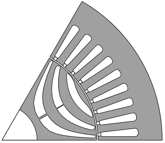 The synchronous reluctance motor (SynRM), as shown in Figure 1, has attracted more and more attention in recent years, even though it has not been widely used in the traction drive field. With 30 years of development, it has achieved the merits of having low cost, high efficiency, low maintenance, high reliability and high temperature resistance [12,13]. In addition, it is also characterized by no back electromagnetic force (EMF), leading to an inherent fault tolerance capability. All these features reveal that the SynRM is an attractive alternative for electrical mobility. Previously, high torque ripple was one of the major concerns for the SynRM. However, it has been proved to be reduced to a quite low level with the appropriate choice of the barrier end angles [14]. The absence of magnets also makes it difficult for the SynRM to achieve a torque density and power factor as high as the IPM motor’s. Extensive efforts have been made on the rotor barrier design to improve the torque density, including fluid-shaped [15], rectangular-shaped [16], circular-shaped [17], U-shaped [17] and hyperbolic-shaped [18] flux barriers. Dual rotor design is also beneficial for improving the torque density [19]. Additionally, it is easy to improve its torque density and power factor by adopting low-cost ferrite or high-performance rare-earth magnet materials into the flux barriers of the SynRMs, i.e., the permanent-magnet-assisted synchronous reluctance motor (PMaSynRM) [20,21,22]. In order to maximize the reluctance torque component, the PMaSynRM design generally starts with the optimization of the SynRM, as evidenced in [23,24].