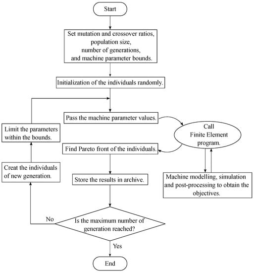 - Sizov, G.Y.; Zhang, P.; Ionel, D.M.; Demerdash, N.A.O.; Rosu, M. Automated Multi-Objective Design Optimization of PM AC Machines Using Computationally Efficient FEA and Differential Evolution. IEEE Trans. Ind. Appl. 2013, 49, 2086–2096. [Google Scholar] [CrossRef]